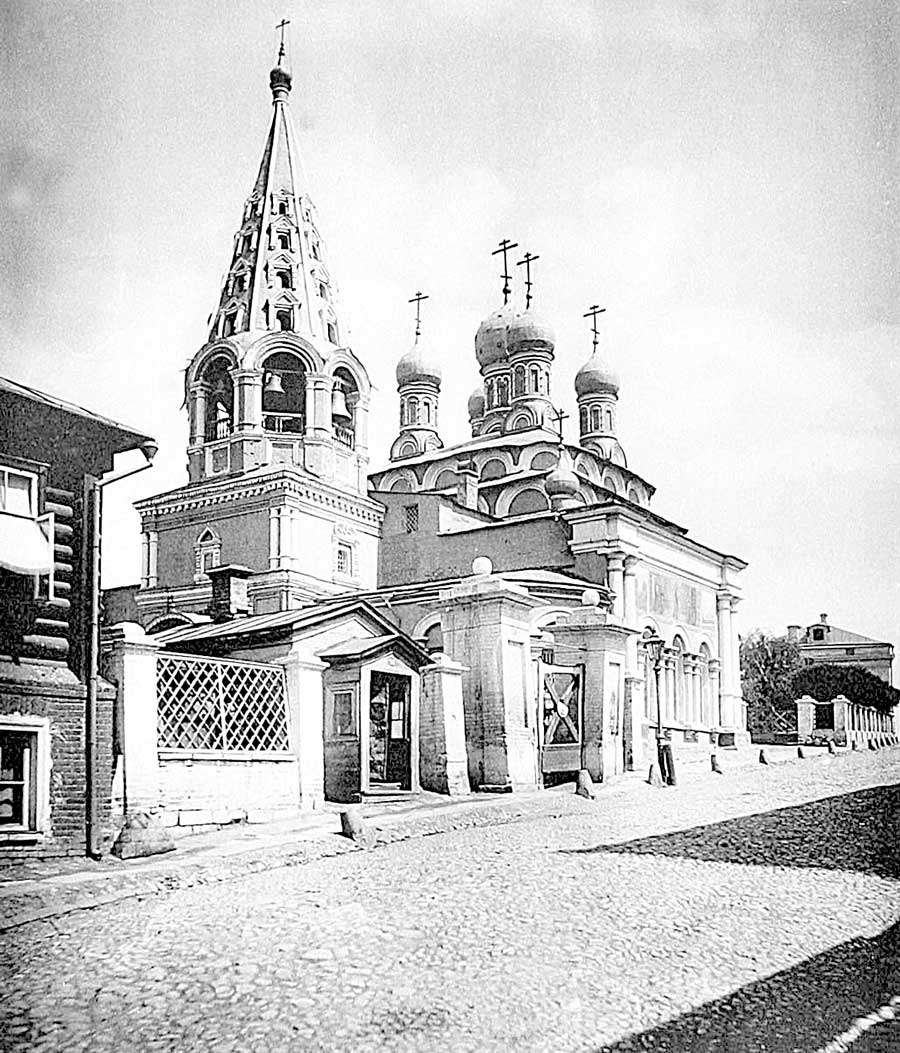 Сергиевская церковь долгое время считалась «артиллерийской», и когда из нее совершался крестный ход на Неглиненский пруд, то пушкари производили «пушечную пальбу». Здание, выстроенное около этого времени, оставалось неизменным до 1763 г., когда пристроили придел иконы Казанской Богоматери. Как бывало обычно, трапезную в XIX в. пришлось расширить, что и было сделано в 1837–1841 гг. Церковь снесли в 1935 г., предварительно закрыв, как было написано в постановлении Моссовета, «в виду острой необходимости помещения для глухонемых» (!). Хотели было выстроить на месте церкви огромное здание клуба, но все окончилось стандартным школьным зданием, которое в последнее время использовалось как помещение для контор Московского метрополитена.