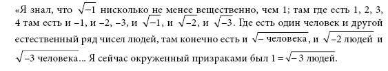 «Это – так давно…, когда со мной случился ?-1 – Однажды Пляпа [учитель математики в школе. – Л. П.]… рассказал об иррациональных числах —… я плакал… и вопил: “Не хочу ?-1! Выньте меня из ?-1!” Этот иррациональный корень врос в меня как что-то… инородное… его нельзя было обмыслить, обезвредить, потому что он был вне ratio. И вот теперь снова ?-1. Я пересмотрел свои записи – и мне ясно:… я лгал себе – только чтобы не увидеть ?-1» («Запись 8-я» [164]);