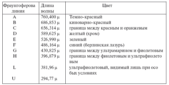 Наиболее привычный для нас источник света – солнце – испускает всевозможные световые лучи, т. е. белый свет. Использовав однако разную преломляемость разных световых лучей, мы можем смешанный солнечный свет разложить, пропустив его сквозь призму из того или иного прозрачного материала. Тогда мы получаем солнечный спектр, в котором цвета расположены в порядке нарастающей преломляемости. В спектре мы замечаем ряд темных, «фраунгоферовых», линий, которые занимают неизменно одни и те же места. При помощи фраунгоферовых линий можно, таким образом, точно установить следующее расположение цветов в солнечном спектре. Наименее преломляются призмой лучи, имеющие наибольшую длину волны; нам эти лучи представляются темно-красными. За ними идут: