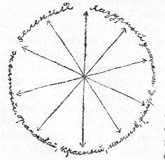 Малиновый цвет на практике может быть рассматриваем как переходной от фиолетового к красному, так что все различаемые нами цвета образуют замкнутый круг. Круг этот имеет значение не теоретическое, ибо никакой объективной, выражаемой цифрами периодичности не соответствует; но он имеет тем большее практическое значение для художников, ибо соответствует периодичности субъективной и позволяет без труда определить и запомнить всю систему так называемых «дополнительных» цветов.