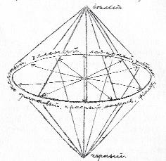 И если бы мы пожелали графически изобразить всю систему цветов, мы не могли бы это сделать иначе, как, вычертив два конуса соприкасающихся основаниями: общее основание – спектр, одна вершина – белый цвет, другая вершина – черный цвет, любое параллельное основанию сечение – та или другая цветовая «гамма», причем все эти гаммы, конечно, парные, каждая положительная (разбеленная) соответствует отрицательной (зачерненной).