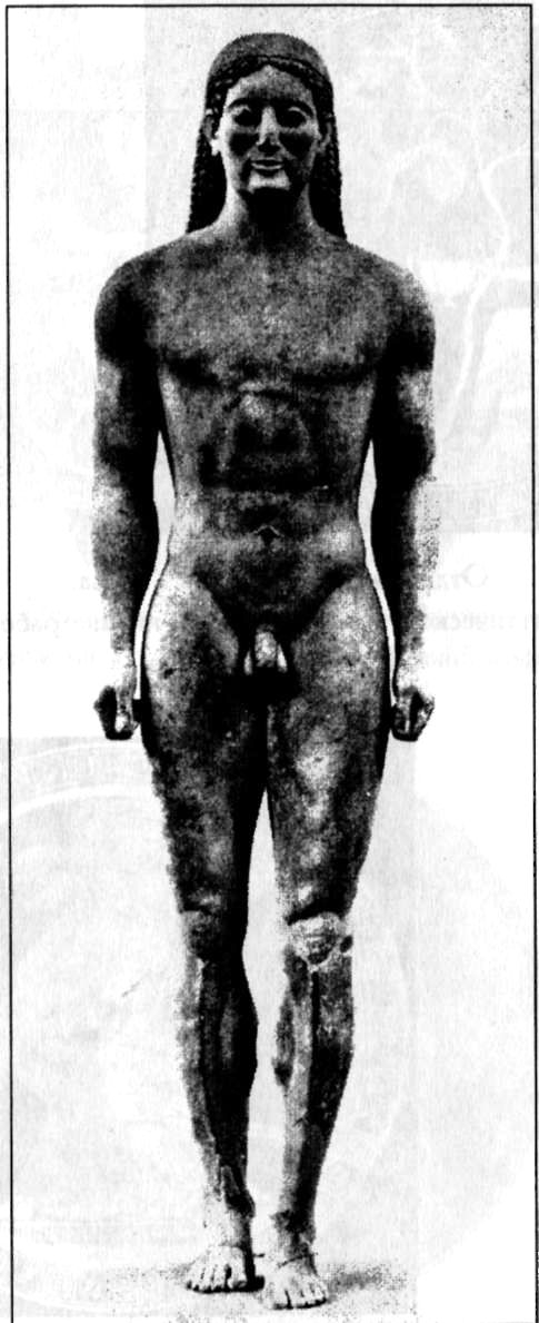 Представление обо всем этом комплексе личных достоинств, отличающих истинного красавца и любимца богов от обычного человека, нашло свое воплощение в целой серии мраморных статуй так называемых «куросов» и «кор», по которым можно проследить шаг за шагом весь процесс эволюции греческой монументальной скульптуры в период ее становления как особого жанра искусства (конец VII—конец VI вв. до н. э.) «Куросами» обычно называют изваяния безбородых юношей, изображенных во весь рост и без всяких признаков одежды на теле, во всем великолепии их атлетической наготы. Хронологически параллельная и стилистически во многом сходная с ними серия «кор» включает фигуры девушек в длинных (до щиколоток), плотно облегающих все тело праздничных одеяниях — пеплосах или хитонах с украшениями на руках и на шее, с повязками-диадемами, напоминающими русские кокошники на голове. Назначение этих статуй могло быть самым различным. Некоторые из них, как это следует из сохранившихся на их основаниях надписей, служили надгробными памятниками. Другие посвящались богам в знак благодарности за чудесное исцеление от тяжелой болезни или избавление от гибели на поле битвы, или какое-нибудь другое подобное же благодеяние (такие статуи обычно находят при раскопках святилищ). Однако независимо от способа их использования и места находки все эти изваяния были связаны между собой общностью вложенных в них их создателями эстетических и вместе с тем религиозно-нравственных идей. В известном смысле слова каждая такая статуя была портретом или, если точнее выразить ту же мысль, магическим двойником, магической заменой некоего конкретного лица. Но это был портрет не буквально реалистический, воспроизводящий во всех деталях подлинный облик человека, а идеальный, изображающий его таким, каким он сам себе и всем окружающим хотел бы казаться, — вечно юным, прекрасным, полным жизни и сил. Судя по всему, это каменное подобие человека, странно скованное в своих движениях, с плотно прижатыми к туловищу руками, с нерешительно выдвинутой вперед левой ногой (у куросов), с блуждающей на губах загадочной «архаической» улыбкой воспринималось греками как единственная доступная смертному возможность избавиться от неумолимого бега времени, как своеобразная замена бессмертия, которую люди той эпохи, не верившие в загробную жизнь, могли представить себе только как вечную славу и память в сердцах последующих поколений. Как верно заметил американский искусствовед Дж. Гарвит по поводу известных дельфийских статуй, так называемых «Клеобиса и Битона», эти и другие куросы «изображают почитаемых покойников как бы выхваченными из неопределенности и быстротечности земного бытия и нашедшими спасение от всеобщей изменчивости в своих застывших, схематичных позах, в предельно обобщенных, повторяющихся чертах лица».