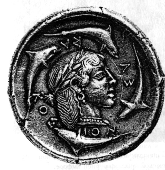 Сиракузская серебряная декадрахма с головой Артемиды Аретузы. 480/79 г. до н.э.