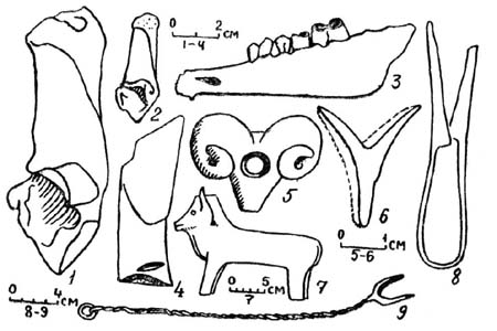 Рис. 12. Кости быка (1), барана (2), козы (3) и свиньи (4), глиняные головки барана (5) и козы (6), скульптурная фигура быка (7), ножницы (8) и вилка (9). 1-4 — Лар, 5-9 — Шапка.