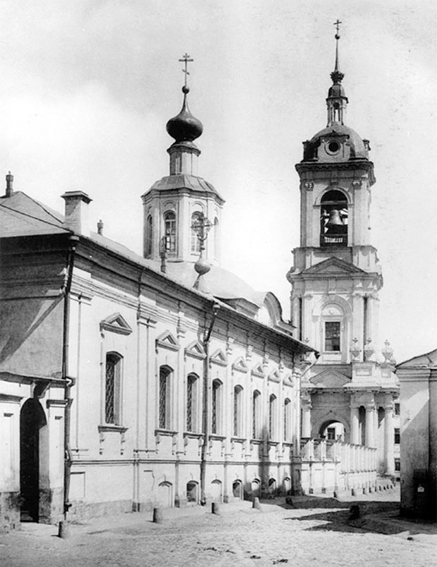 В 1514 году обветшавшая деревянная монастырская церковь Усекновения главы Иоанна Предтечи была перестроена в камне «по особому благоволению» князя Василия III известным итальянским зодчим Алевизом Фрязином Новым (Альвизо Ламберти да Монтаньяно). Вероятнее всего, это был первый каменный храм в Замоскворечье. Должен заметить, что некоторые современные исследователи не согласны с тем, что Алевиз Фрязин работал в Замоскворечье. Опровергается даже мнение о строительстве здесь в начале XVI века каменного храма. В 1578 году царь Иван IV, митрополит Московский Антоний, бояре и весь честной народ встречали у церкви святые мощи князя Михаила Черниговского и его верного боярина Феодора, перенесенные из Чернигова крестным ходом. В память об этом на противоположной стороне переулка был построен деревянный храм, освященный во имя черниговских чудотворцев. Возле него мы еще остановимся.