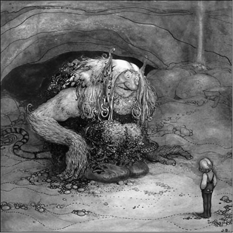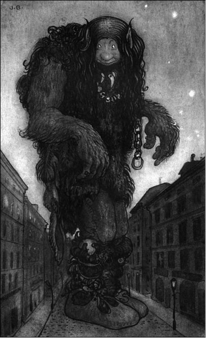 Горный тролль. Иллюстрация Й. Бауэра (1904). На первом этапе тролль делается похожим на человека, но не теряет свирепости