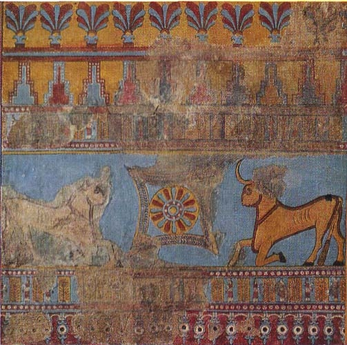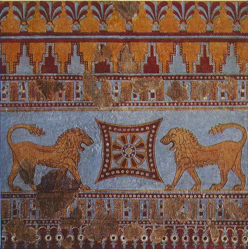 [62] Урартские росписи очень близки к росписям ассирийских дворцов. Они достаточно хорошо известны начиная с XIII века до н. э. и кончая стенными росписями VIII века до н. э. во дворце ассирийского наместника в Тил-Барсибе на Евфрате. Если в царских дворцах главным украшением залов служили раскра-