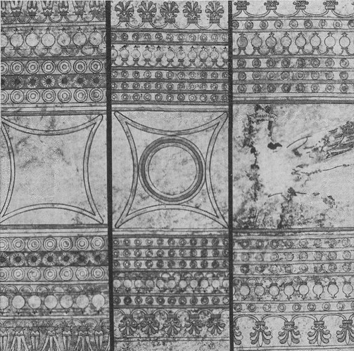 западном углу здания, где лежал большой кусок обвалившейся стенной обмазки с росписью трех цветов, как и на Кармир-блуре, - белой, синей и красной. На фрагменте был совершенно четко виден орнамент, состоящий из пяти рядов. В верхней части на выступающем карнизе шел ряд кругов с вписанными в них звездами, под ним помещались чередующиеся синие и красные пальметки, третья полоса [80] состояла из ряда ступенчатых башенок. Неширокий фриз, расположенный под этими тремя рядами с орнаментами, был заполнен фигурками бычков и барашков, а под фризом в пятом ряду изображены божества, стоящие по сторонам священных деревьев с круглыми плодами. В руках у каждого божест-