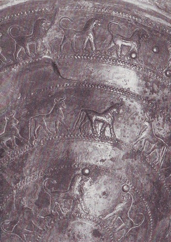 Такой щит разделен на три концентрических круга широкими полосами с плетенкой или розетками. На одном щите центр гладкий, на другом - прочеканена розетка. Внутри кругов помещены фигуры львов и быков, причем половина животных идут вправо, половина - влево. Таким образом, ни одна фигура не смотрится в перевернутом виде. Характерна для урартского орнамента очень нарядная декоративная отделка туловища животных. Она делалась тонкими инструментами, после того как на поверхности щита штампом наносили фигурку животного.