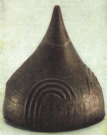 Первые урартские щиты были найдены в прошлом веке. Обломок одного из них находится в музее в Берлине, два других в Лондоне, в Британском музее. Они относятся к последнему урартскому царю Русе, сыну Эримены. Орнамент и техника чеканки щита такие же, как на описанных выше. Это свидетельствует об очень устойчивой и неизменной традиции в украшении щитов и вообще оружия[5]. Очень близка к щитам техника отделки урартских шлемов, имеющих форму остроконечного шишака. В раскопках Тейшебаини их найдено 20, на многих выгравированы посвятительные надписи. Обычно украшение шлема занимало лобную часть, височную и затылочную.