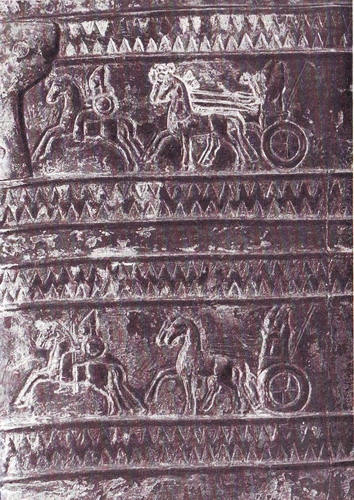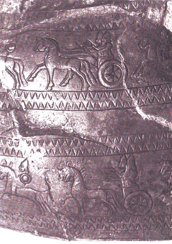 Восемнадцать колчанов из крепости на Кармир-блуре также украшены полосами с изображением всадников и боевых колесниц, таких же, как на шле-