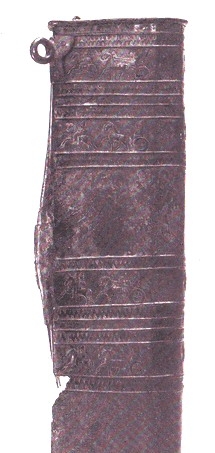 [90]мах. И только на одном обломке колчана изображены идущие львы и быки, как на щитах. Очень интересен найденный на Кармир-блуре бронзовый пояс шириной 12 см и длиной в один метр. По краям идет кайма, состоящая из четырех лепестковых розеток, спиралей и пальметок. Такая же