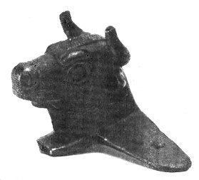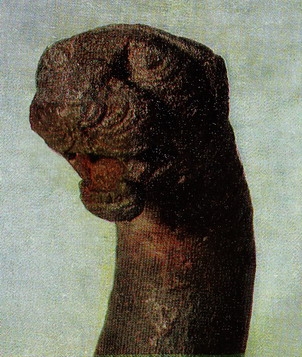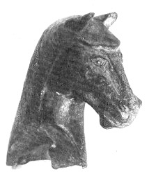 происходящих из раскопок Кармир-блура, особенно выделяется бронзовая головка коня. Несмотря на очень небольшие размеры, голова была отлита из отдельных частей: морда, грива, челка и уши после отливки были спаяны вместе, при этом так плотно, что только в местах изломов можно обнаружить спайку. Очень выразительно переданы глаза, рот, ноздри и горделивая посадка головы. Судя по [95] ассирийским рельефам, где дышла колесниц украшали конскими головами, можно предположить, что и эта голова имела такое же назначение. Вообще в изображении животных урартские мастера достигли большого совершенства. Даже маленькие головки быков на бронзовом ведерке из Тейше-