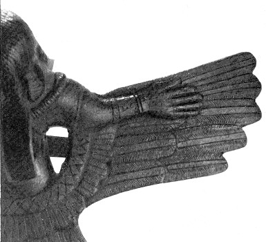 покрыты чеканкой, так же, как и тиара, украшенная рогами. Сохранились следы позолоты. Строгое лицо с чертами, характерными для урартских изображений, позолота и орнаментальность чеканки придают скульптуре большую декоративность. Таковы и все части мебели, найденные в различных местах и хранящиеся в музеях Лондона, Парижа, Ленинграда. Близка по типу к вышеописанной [98] фигурке части трона и другая в виде крылатого быка с человеческим торсом, повернутым влево. Только вместо чеканки крылья покрыты углублениями для инкрустации, которая так же, как и лицо, не сохранилась. Почти совпадает с ней другая - тоже в виде крылатого быка, также с утраченной инкрустацией лица и крыльев и с шеей, разделанной чеканкой под перья птицы. Нарядностью и декоративной отделкой отличаются ножки тронов. Особенно интересна та, где сохранилась часть рамы с прикрепленной к ней фигуркой лежащего крылатого льва. Среди подобных украшений встречаются также и крылатые грифоны. Интересны фигурки бога, стоящего на животном.