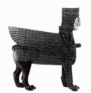В искусстве Урарту особое место, по количеству найденного материала и по высокому качеству работы, занимают бронзовые украшения мебели. Эти памятники стали известными раньше всех других, так как они попали в музеи Лондона, Берлина, Ленинграда еще в конце XIX века, задолго до начала систематических раскопок на территории страны Биайни. Среди них имеется целый ряд таких [97] великолепных изделий, что их с полным правом можно считать шедеврами. К их числу относится часть трона, попавшая в Эрмитаж в 1885 году. Она представляет собой крылатого льва с человеческим торсом. Лицо этой бронзовой фигурки сделано из камня, глаза и брови инкрустированы. Крылья