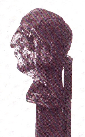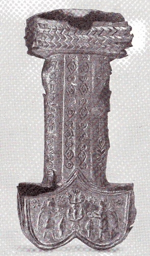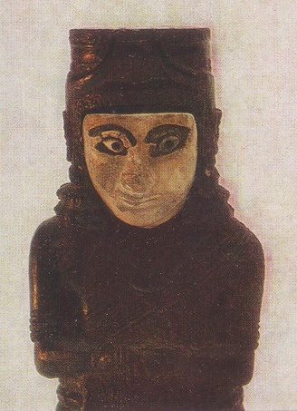 [105] Следует назвать также и четыре деревянные фигурки богов, чудом уцелевшие от огня во время пожара в Тейшебаини. Их нашли в куче обгорелых веток. Три из них представляют собой бородатых богов, четвертая - богиню, держащую маленькое зеркальце и опахало. Боги изображены в длинных одеждах