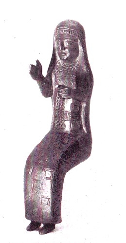 Вторая статуэтка - жена бога Халди, Арубани[10]. Богиня изображена сидящей (очевидно, на троне, [102] но он не сохранился). На Арубани надето длинное платье, на голове покрывало, которое ниспадает на спину. Чеканкой по бронзе выполнен орнамент на платье и покрывале и нагрудное украшение богини. Правая рука с открытой ладонью согнута в локте и вытянута вперед, левая сжата в кулак, в котором имеется круглое отверстие. По-видимому, в нее был вставлен какой-то предмет, возможно, ветка, как на бронзовом медальоне, о котором будет сказано ниже.