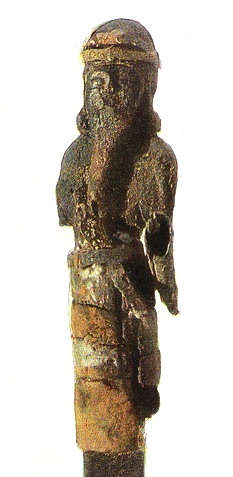 [99] Их сохранилось всего пять. Они также сделаны из позолоченной бронзы. Фигура бога (из пяти полностью сохранилась только одна, и то вставное лицо из камня утрачено) прямая, как столбик, большое внимание здесь уделено чеканке орнамента на одежде. Возможно, это были тоже части мебели,