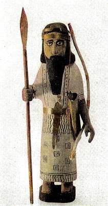 [104] Третья статуэтка найдена в другой кладовой Кармир-блура. Она представляет собой человека с хвостом скорпиона. На ней сохранились следы раскраски - белое лицо, красные глаза, бурая борода и волосы, ярко-голубой головной убор. Эта статуэтка тоже была богом, охранителем кладовой.