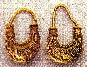 делий Урарту так же, как и для всех стран древнего мира. Подобные изделия дошли до нас из Древнего Египта, Месопотамии, Передней Азии, Древней Греции и Рима. Секрет этой тончайшей техники до сих пор окончательно не разгадан, хотя ученые и продолжают работать над этой проблемой. Особенно хорошо выполнены две серьги. Серьги в форме полого внутри калачика покрыты орнаментами [113] из тонкой проволоки и мелкой зерни. Их нашли в одной из кладовых Кармир-блура спрятанными в небольшую бронзовую чашу. Серьги такого типа встречаются в VIII-VII веках до н. э. во всех странах Средиземного моря [15]. Из серебра изготовляли и серебряные сосуды -