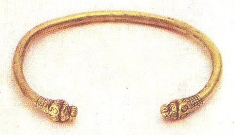 ножнах мечей - акинаках, на золотом поясе из Келермеса и в целом ряде других изображены львы и быки, священные деревья, головы людей, очень близкие по стилю к урартскому чеканному орнаменту. Характерна графическая разделка фигур быков, повторяющая урартские образцы. Связи скифов с урартами были достаточно близкими, что сказалось и на искусстве. В этом отношении много [94] материала дают находки скифских кладов, где ярко проступают древневосточные мотивы. Возможно, это обусловлено пребыванием скифов в Приурмийском районе, о чем свидетельствуют ассирийские надписи. Среди произведений художественного ремесла,