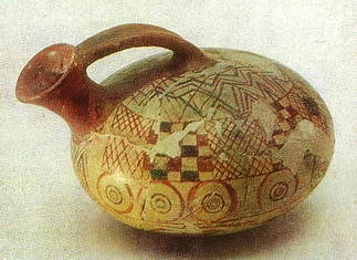 Кроме простой керамики, там же была извлечена из земли и парадная посуда. К ней можно отнести сосуд из светлой лощеной глины типа античного [117] "аска" (одноручный сосуд в форме чуть сдавленного сверху и снизу шара и выступающим сбоку горлом). Он расписан по поверхности геометрическим орнаментом, состоящим из квадратов, кругов, зигзагообразных линий и сетки. Второй кармир-блурский сосуд называется "кернос" - у него
