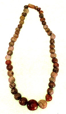 овальное тулово, широкая ножка и высокое широкое горло, вокруг тулова прикреплены к нему маленькие горшочки. Подобные сосуды имели широкое распространение и служили для возлияний во время исполнения религиозных обрядов. Особенно интересна форма двух других сосудов Кармир-блура в виде сапожков, точно передающих форму обуви. Один из них покрыт росписью, [118] близкой по типу к орнаменту аска. Вверху по кремовому фону полоса с шахматным узором и кружками. Так же расписан и носок. Второй сосуд из черной лощеной глины покрыт узором из вдавленных штампом линий и треугольников. Его форма передает урартскую обувь из мягкой кожи с длинным носком и без подшитой подошвы из другого материала. Линии орнамента идут по швам сапожка, и даже шнуровка спереди передана на обоих сосудах. Для более ясного представления об урартском искусстве остается упомянуть о печатях. В Урарту были распространены подвесные печати. Они нередко служили одновременно и амулетами. Поэтому у них всегда было отверстие для продевания шнура. Форма их разнообразна - конические, гиреобразные, цилиндрические, в виде четырехгранного столбика, дисковидные. На печатях обычно изображения животных, богов, культовых сцен выполнялись очень схематично. На некоторых помещались сцены, связанные с придворной жизнью и царем. Оттиски печатей были найдены в Тейшебаини на буллах от кладовых. На некоторых письмах - приказах из архива Тейшебаини - тоже сохранились отпечатки, которые совпадают с буллами. Печати обычно делались из камня, на которых металлическим острым инструментом вырезали рисунок. Много каменных бус было найдено на Кармир-блуре. Для них употребляли самые различные породы- сердолик, яшма, сардоникс, стеатит и горный хрусталь.