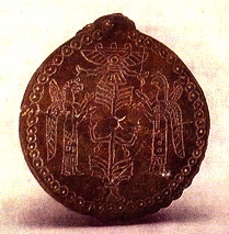 Произведений ювелирного искусства урартов сохранилось немного. К сожалению, кладоискатели не понимали подлинной ценности древних предметов из дорогих металлов, продавали их на переплавку. Один золотой медальон круглой формы попал в Берлинский музей. На нем изображена сидящая на троне богиня, перед ней женщина. Фигурка богини совершенно точно воспроизводит бронзовую статуэтку богини Арубани. Очень близка по типу и серебряная подвеска Берлинского музея - на ней изображена тоже сидящая богиня с чашей в одной руке и веткой в другой. Перед ней стоят женщина и козленок, вероятно, жертвенное животное. Справа [111] и слева два дерева с кроной в форме листа, внизу зигзагообразный орнамент - в отличие от орнамента из гирлянды бутонов на медальоне. Обе эти вещи представляют собой лучшие образцы ювелирного искусства Урарту. Два серебряных медальона из Кармир-блура, тоже с изображениями сидящей богини на одном и стоящего бога и фигурами людей перед ними на втором, сделаны довольно грубо. Интересно отметить, что на обоих медальонах головы божеств сделаны на напаянной золотой пластинке, что создает впечатление нимба вокруг их голов.