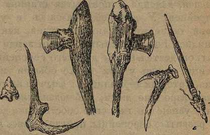 Оружие из камня, дерева и кости древнего европейца (налево) и современного дикаря (направо).