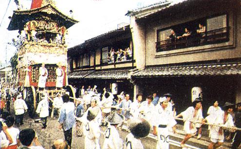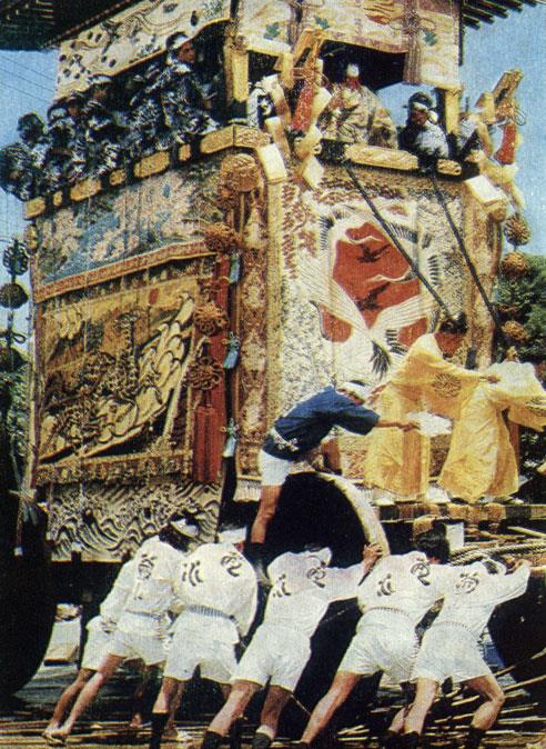 Одна из богато украшенных ритуальных колесниц типа хоко на празднике Гион