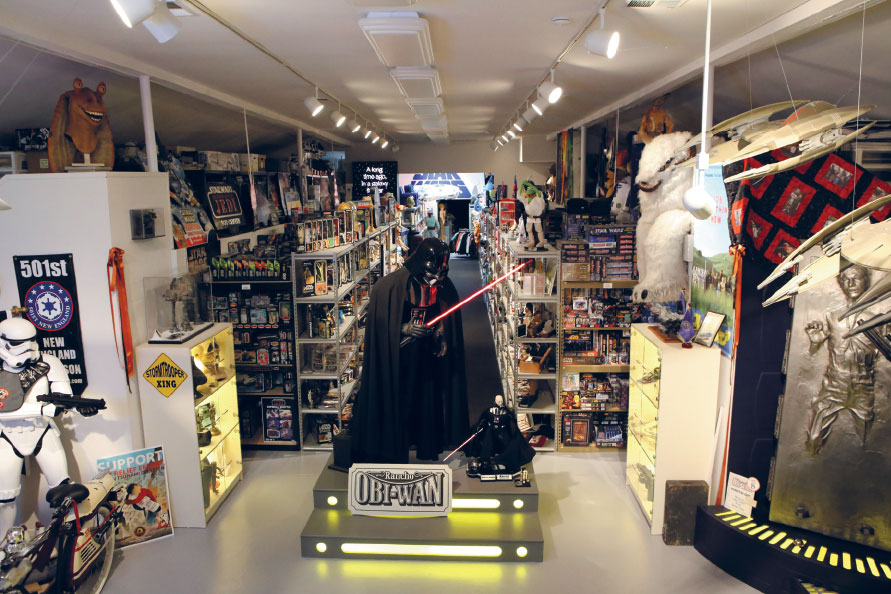 Несколько секунд спустя, когда ваши глаза привыкают к освещению, вы видите заполненные ряды. Куча предметов, связанных со «Звездными войнами», плотно стоят на полках, как в магазине, где мало места – только места тут бесконечно много, стены уходят в бесконечность, вдоль каждой стены как минимум две полки, а вдали виднеются собранный из Лего Боба Фетт в натуральную величину и рекламная растяжка «Звездных войн» 1977 года. За этим залом есть еще комнаты: коридор, выглядящий один в один как на «Тантиве IV», ведет к картинам, игровым автоматам и прочему.