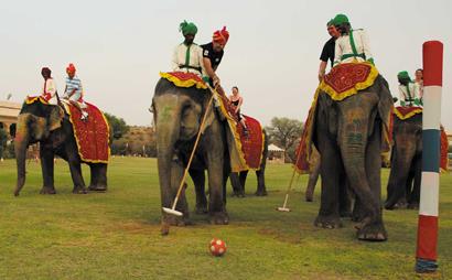 Играть в слоновье поло придумали индийские махараджи в конце XIX века с подачи своих английских покровителей. В отличие от резкого и травмоопасного поло на лошадях, слоновье – подходит не только для молодых джигитов, но даже для пожилых леди. Не нужно уметь управлять слоном – «за рулём» многотонного зверя сидит погонщик-махаут, вооружённый палкой с металлическим крюком на конце, на случай если зверь начнёт чудить. С каждой стороны выступает по три слона, причём отличить своих от чужих можно лишь по цвету тюрбана погонщика. Игрок сидит за спиной махаута, держась ногами в стременах и одной рукой за верёвку.