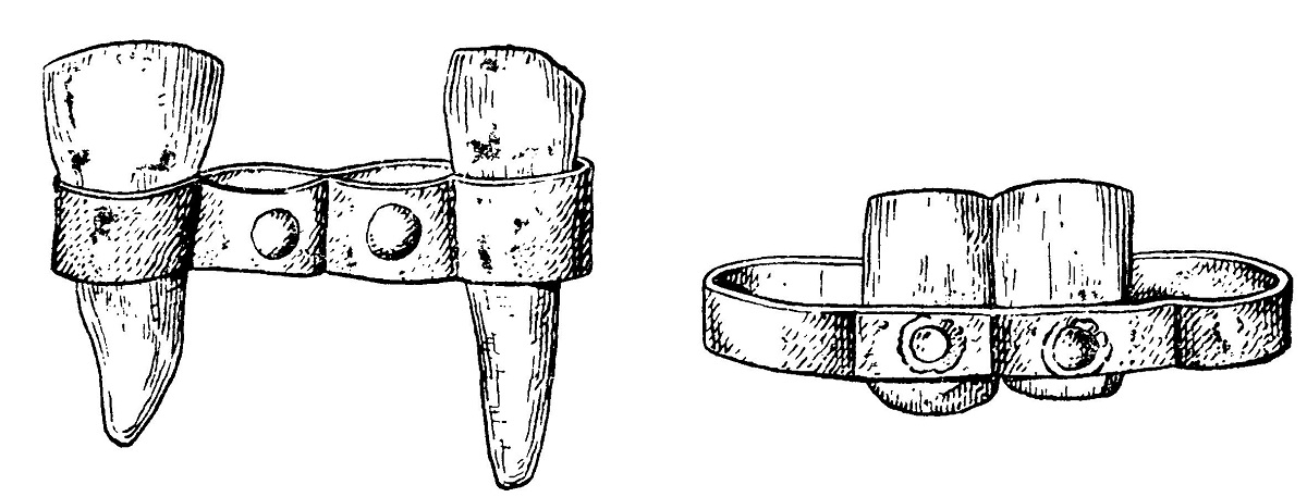 Другой вид протеза предназначался для укрепления шатающихся зубов. Чтобы устранить этот недостаток, этрусские дантисты тонкой золотой проволочкой, словно спиралью, опоясывали основание зубов.