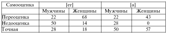 Чтобы проверить чувствительность информантов к языковым нормам, Траджилл провел с ними тесты на самооценку [1972; 1974а]. Он представил информантам записи определенных слов с двумя или более вариантами произнесения, варьирующими от престижного до непрестижного норвичского варианта. Информантам предлагалось отметить наиболее близкую и привычную им форму употребления. В тест были включены варианты [ег] в словах ear, hear, idea и [а] в словах gate, face, пате. В примере с [ег] только 28 % мужчин-информантов и 18 % женщин – информантов реагировали точно (то есть утверждали, что используют форму, соответствующую актуальному употреблению в неподготовленной речи, как в записи интервью). Неустойчивые 68 % женщин (и 22 % мужчин) переоценивали себя (over-reported), то есть отмечали использование престижной формы, когда на самом деле их показатель говорил об обратном. С другой стороны, половина мужчин (50 %) и 14 % женщин недооценивали себя (under-reported), то есть утверждали, что применяют нестандартный вариант, в то время как, согласно тесту, они привычно употребляли формы, близкие к литературному произношению.